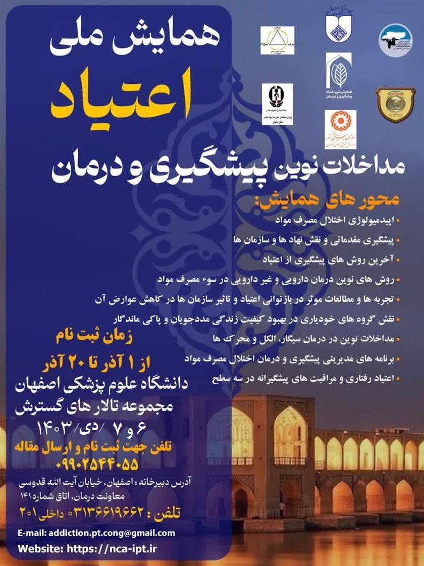 به اطلاع اساتید، متخصصان و پژوهشگران می رساند دانشگاه علوم پزشکی اصفهان درنظر دارد همایش ملی اعتیاد مداخلات نوین پیشگیری و درمان را با هدف دستیابی به آخرین یافته های علمی و ارتقاء آگاهی درمانگران در حوزه پیشگیری درمان و توانبخشی اعتیاد ، طی روزهای 6 لغایت 7 دی ماه سال جاری برگزار نماید.