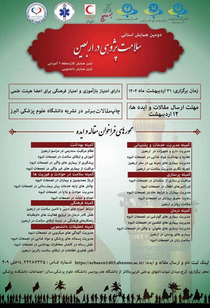 به اطلاع اعضای هیات علمی، اساتید، دانشجویان، همکاران و علاقمندان پژوهش می رساند، معاونت آموزشی دانشگاه علوم پزشکی البرز در نظر دارد، با توجه به اهمیت و ارتقاء سطح سلامت افراد شرکت کننده در تجمعات انبوه، با تاکید بر راهپیمایی اربعین حسینی " اولین همایش کلان منطقه شش آموزشی و دومین همایش استانی سلامت پژوهی در اربعین، همراه با اولین همایش دانشجویی " را در روز چهارشنبه ۳۱ اردیبهشت ماه ۱۴۰۴ برگزار نماید.