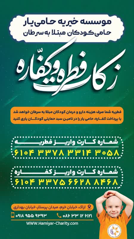 موسسه خیریه حامی یار، حامی کودکان مبتلا به سرطان به عنوان اولین و تنها تشکل ملی استان مرکزی در نظر دارد به مناسبت فرارسیدن عید سعید فطر با هدف ترویج فرهنگ انسان دوستانه نسبت به جمع آوری فطریه و نذورات مردمی در راستای حمایت از کودکان مبتلا به سرطان اقدام می نماید. این کمک ها صرف هزینه ی دارو و درمان کودکان مبتلا به سرطان خواهد شد.
