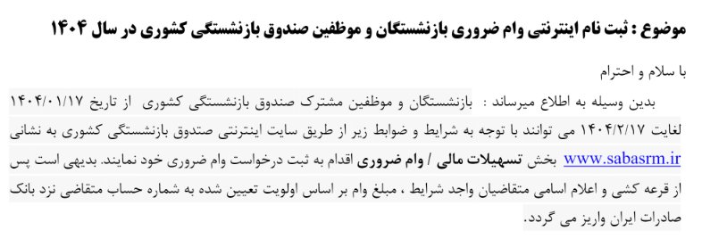 ثبت نام اینترنتی وام ضروری بازنشستگان و موظفین صندوق بازنشستگی کشوری ۲۰ فروردین ۱۴۰۴ | ۱۱:۵۹ کد : ۵۰۶۴۱ اطلاعیه ارسال به دیگران نام شما ایمیل شما ایمیل دریافتکننده ارسال انصراف تعداد بازدید:۵۰۰۹ ثبت نام اینترنتی وام ضروری بازنشستگان و موظفین صندوق بازنشستگی کشوری