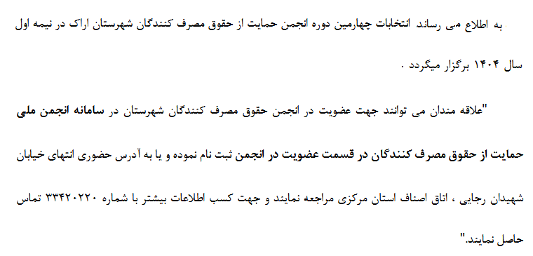 چهارمین دوره انتخابات انجمن حمایت از مصرف کنندگان شهرستان اراک برگزار می گردد. اطلاعیه اداره کل صنعت ، معدن و تجارت استان به شرح زیر می باشد.