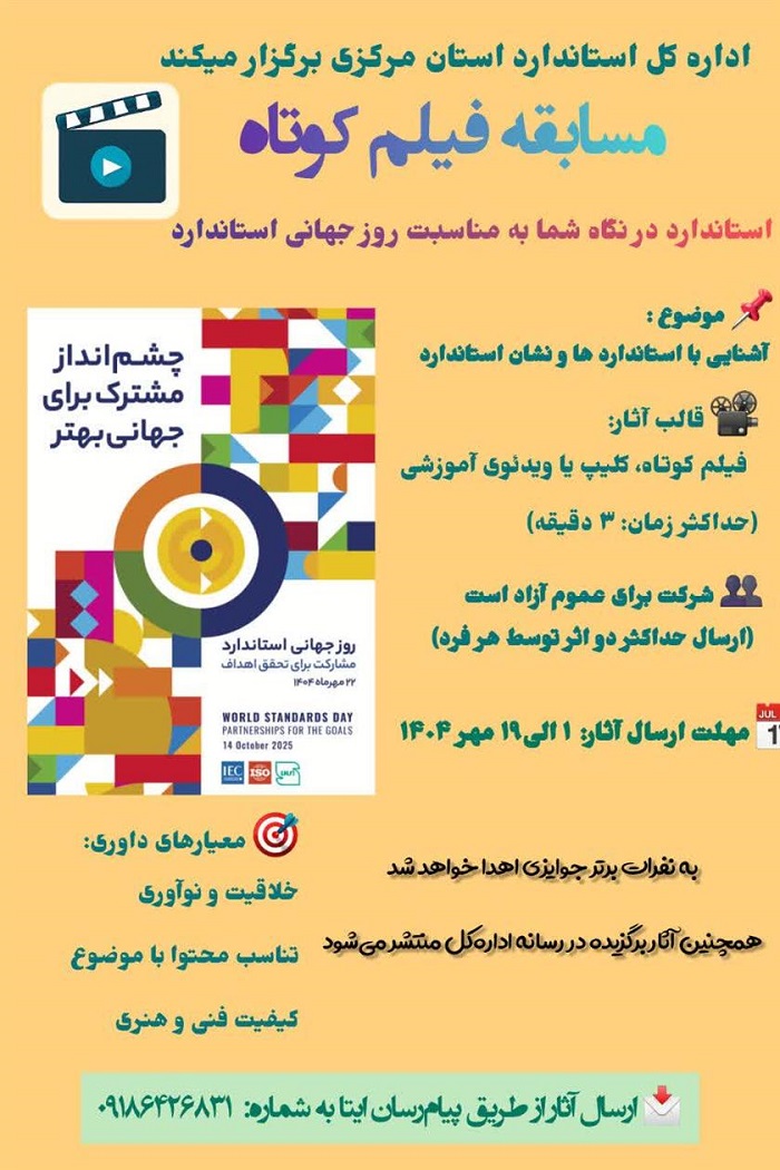 از کلیه علاقه مندان، دانشجویان، دانش آموزان، هنرجویان و فعالان حوزه فیلم و رسانه دعوت می گردد آثار خود را با موضوعات مرتبط با اهمیت استاندارد در زندگی روزمره، نقش استاندارد در کیفیت محصولات و خدمات و آشنایی عمومی با استانداردها تهیه و تا تاریخ ۱۴۰۴٫۰۷٫۱۹ از طریق پیام رسان ایتا به شماره ۰۹۱۸۶۴۲۶۸۳۱ به دبیرخانه مسابقه ارسال نمایند. از آثار برگزیده در مراسم گرامیداشت روز جهانی استاندارد تقدیر بعمل خواهد آمد.