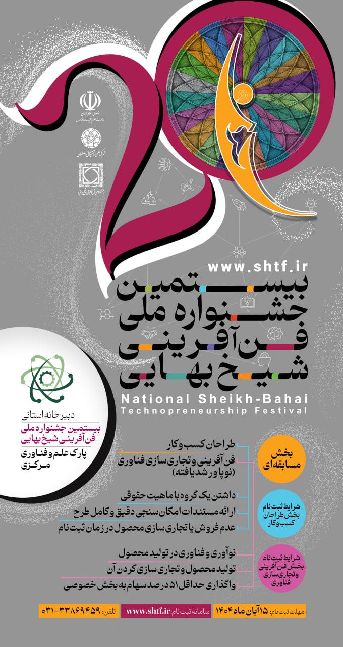 به اطلاع می رساند بیستمین دوره جشنواره ملی فن آفرینی شیخ بهایی که از  قدیمی ترین و معتبرترین رویداد فناوری و نوآوری کشور می باشد در سال ۱۴۰۴ در دست  برگزاری است و پارک علم و فناوری استان مرکزی به عنوان دبیرخانه استانی این جشنواره، مسئولیت هماهنگی و پیگیری برگزاری آن در سطح استان را بر عهده دارد.