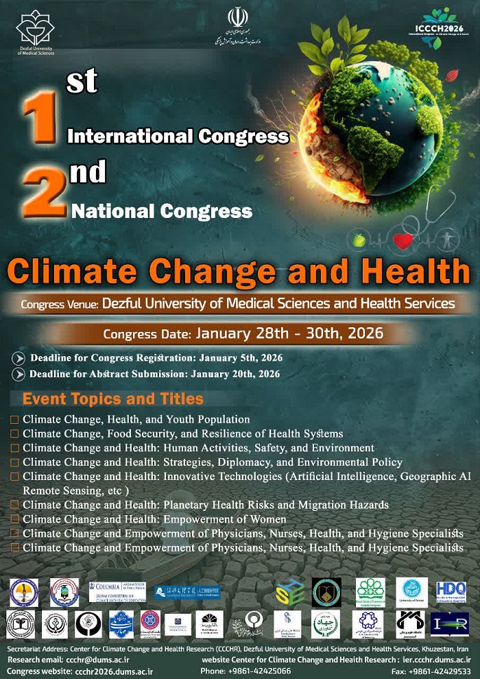 به اطلاع اعضای محترم هیئت علمی، پژوهشگران، دانشجویان و علاقه مندان می رساند، اولین کنگره بین المللی تغییر اقلیم و سلامت، توسط دانشگاه علوم پزشکی دزفول، با حضور اساتید، پژوهشگران، صاحب نظران داخلی و بین المللی در حوزه سلامت و اقلیم برگزار خواهد شد. هدف از برگزاری این کنگره بررسی اثرات مستقیم و غیر مستقیم تغییرات اقلیمی بر سلامت انسان، نظام سلامت، زیر ساخت های درمانی و آمادگی در برابر مخاطرات نوظهور زیست محیطی است.مقالات برگزیده پس از داوری علمی در مجموعه مقالات کنگره منتشر و برخی از  آنها جهت چاپ در نشریات معتبر علمی معرفی خواهند شد. همچنین گواهی حضور و ارائه مقاله برای شرکت کنندگان صادر  خواهد شد.