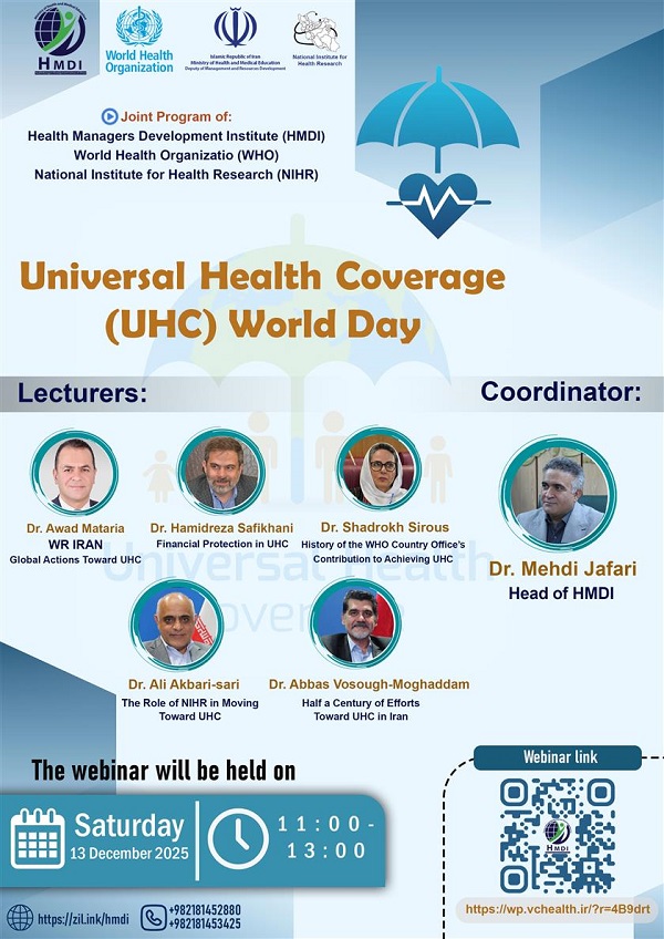 به اطلاع می رساند، موسسه عالی تربیت و توسعه مدیران نظام سلامت، در نظر دارد به مناسبت روز جهانی پوشش همگانی سلامت (UHC Day)  رویداد وبیناری با هدف مرور آخرین تحولات فرصت ها، چالش ها و دستاوردهای مرتبط با پوشش همگانی سلامت، در نظام سلامت ایران را برگزار نماید.
