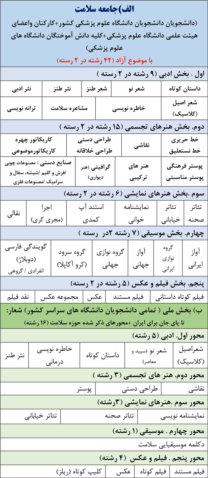 به اطلاع می رساند اداره کل فرهنگی معاونت فرهنگی و دانشجویی وزارت متبوع، در راستای ترویج و گسترش فرهنگ ناب و غنی ایرانی - اسلامی و همچنین بهره مندی از ابزار هنر در تحقق عناصر آن و همچنین به منظور شناسایی و رشد استعدادهای فرهنگی و هنری جامعه سلامت کشور، اعم از دانشجویان و دانش آموختگان نظام سلامت، اساتید، کارکنان و سایر علاقمندان اقدام به برگزاری سیزدهمین دوره جشنواره فرهنگی هنری نظام  سلامت (سیمرغ) نموده است.