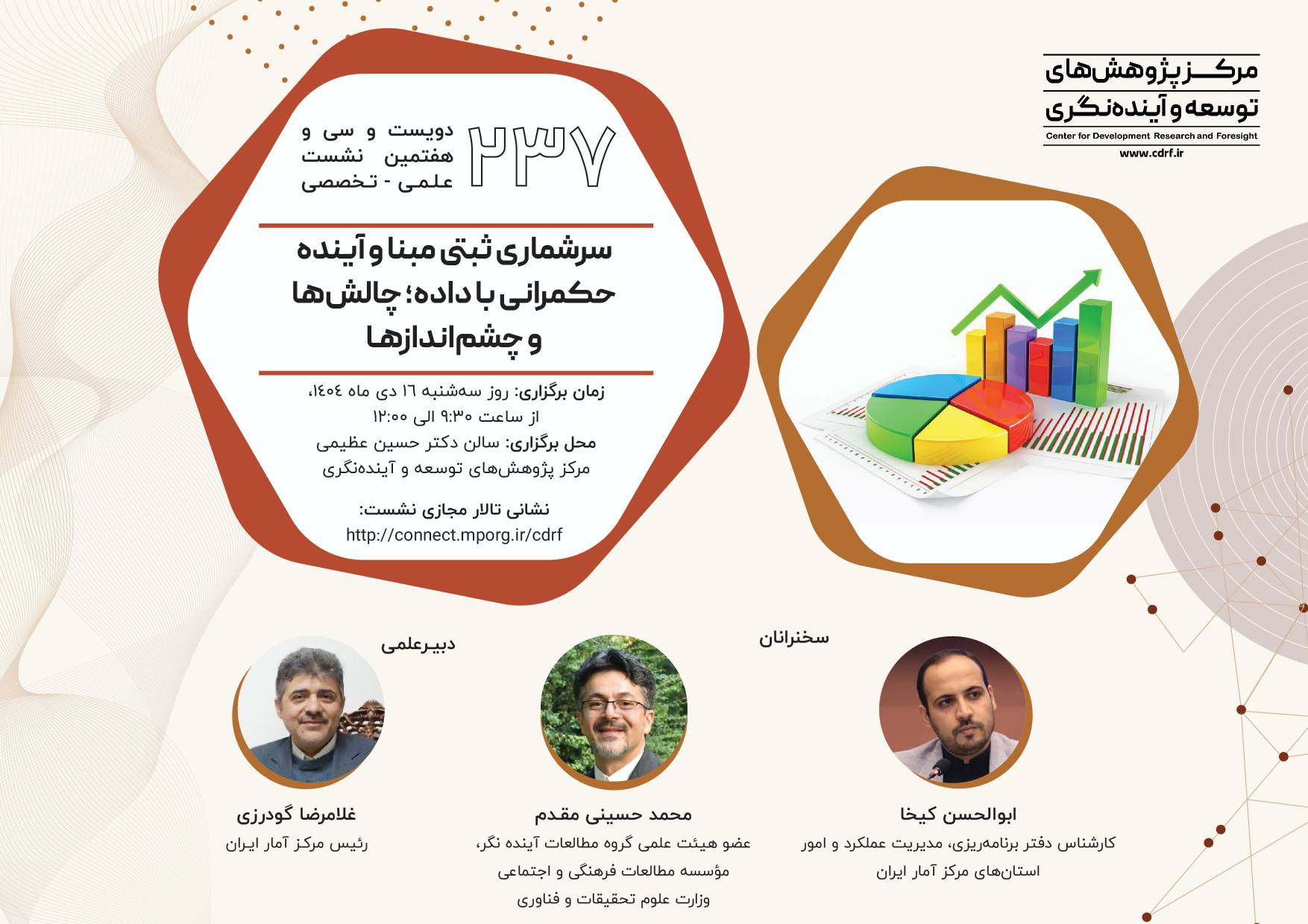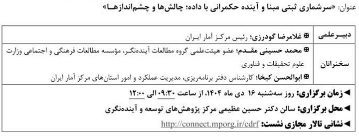 نشست علمی سرشماری ثبتی مبنا آینده حکمرانی با داده ۱۴ دی ۱۴۰۴ | ۱۰:۲۱ کد : ۵۷۴۱۸ اطلاعیه ارسال به دیگران نام شما ایمیل شما ایمیل دریافتکننده ارسال انصراف تعداد بازدید:۴۳۴ دویست وسی وهفتمین نشست علمی - تخصصی با عنوان سرشماری ثبتی مبنا آینده حکمرانی با داده، چالش ها وچشم اندازها