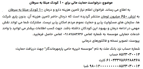 درخواست حمایت مالی، برای ۱۰ کودک مبتلا به سرطان ۰۷ بهمن ۱۴۰۴ | ۱۱:۳۳ کد : ۵۷۷۳۲ اطلاعیه ارسال به دیگران نام شما ایمیل شما ایمیل دریافتکننده ارسال انصراف تعداد بازدید:۵۹ موسسه خیریه حامی یار، درخواست حمایت مالی، برای ۱۰ کودک مبتلا به سرطان را دارد.